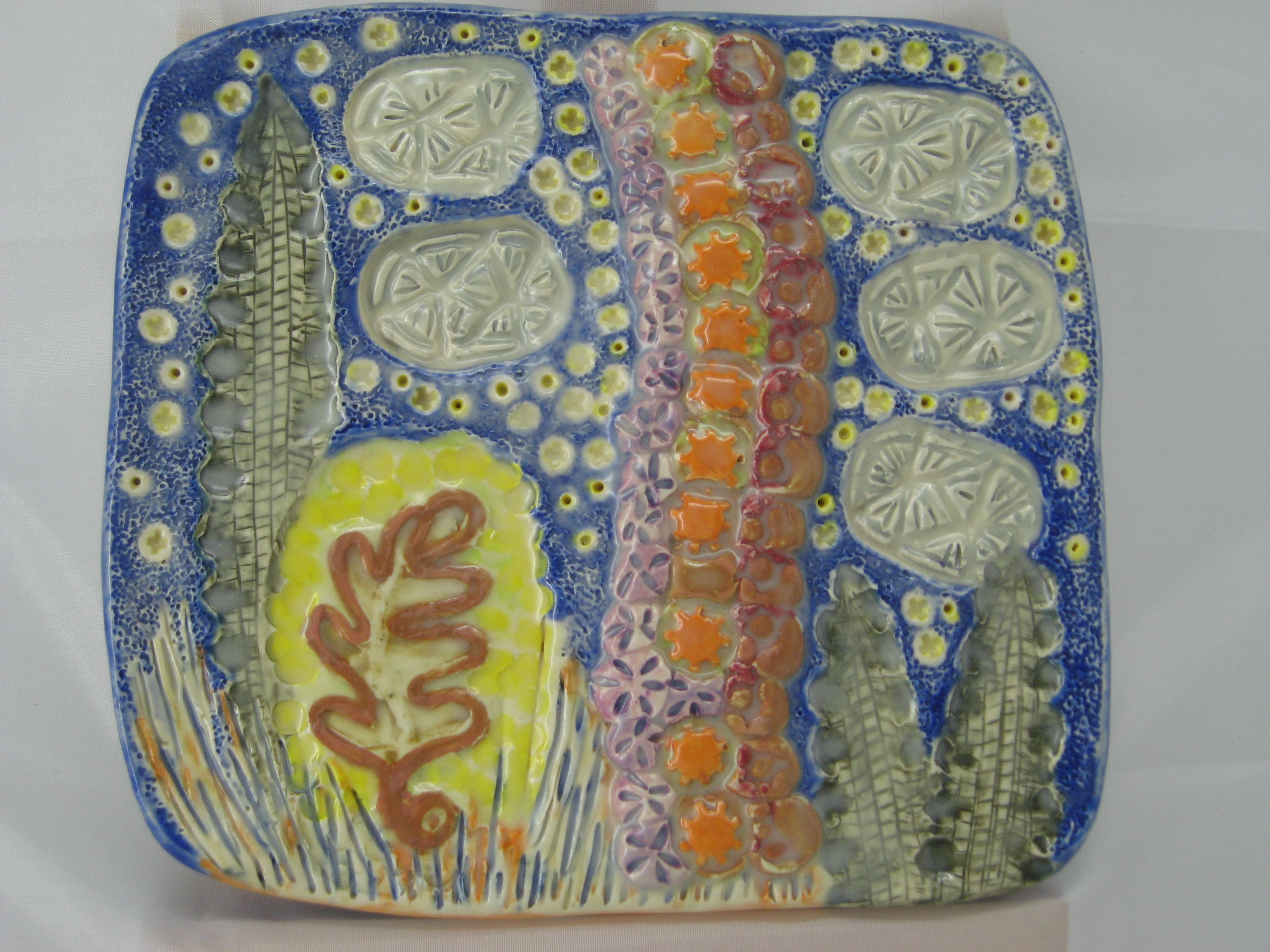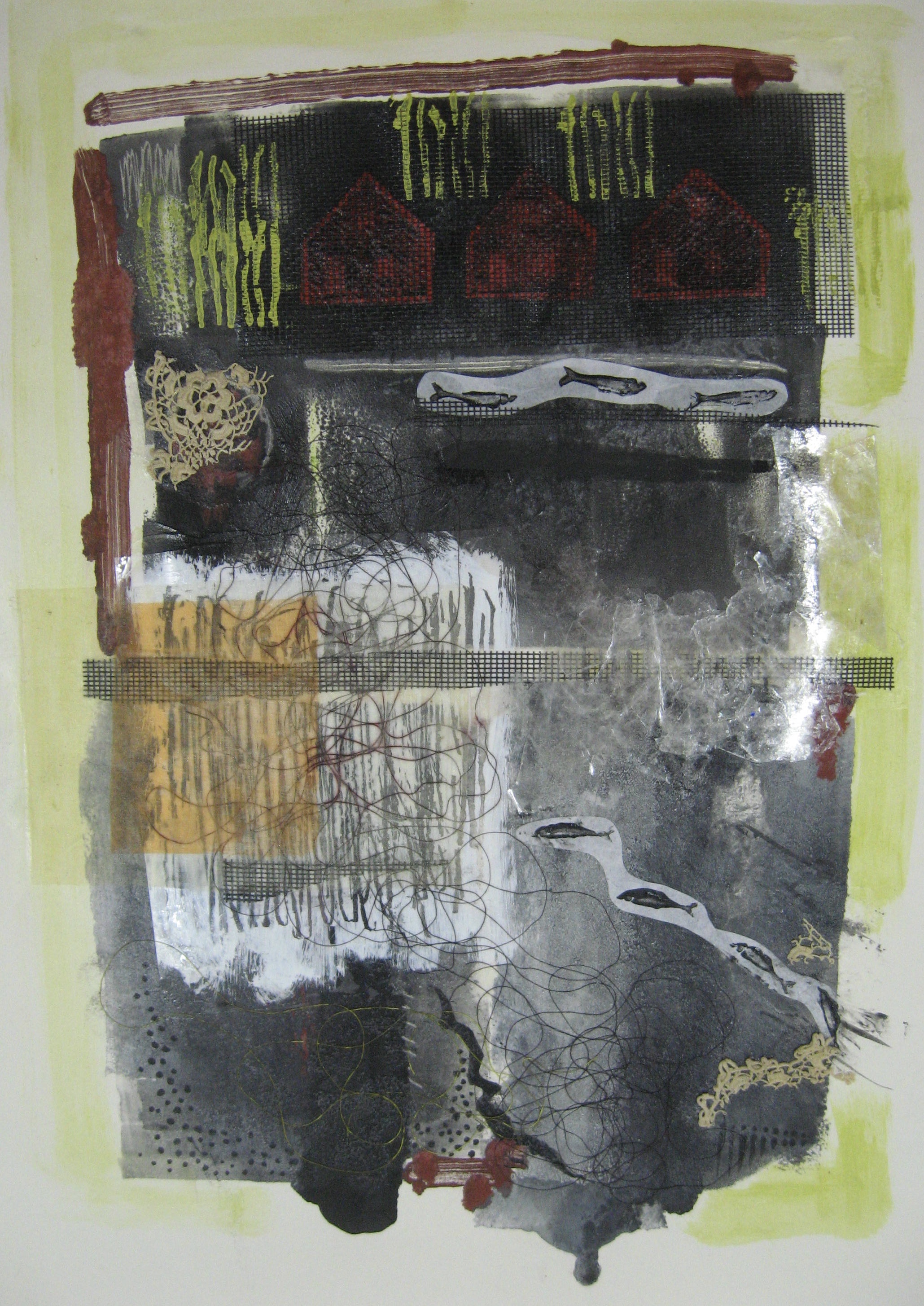 The detail in Ms. Grentzenberg’s art pulls the viewer into a created world, at times surreal, whimsical, and finally colorful. Her latest works have returned to mixed media, combining found materials and working in abstract designs.
