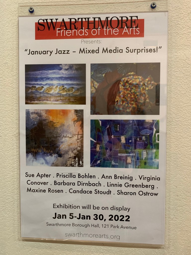 the January exhibit has such a variety of outstanding mixed media art from Mixed Media 10 artists, and should not be missed. The show will be up through the end of January so there is still time to see and appreciate the artwork. When it town, stop by Borough Hall /Library and check out the work of so many talented local artists.