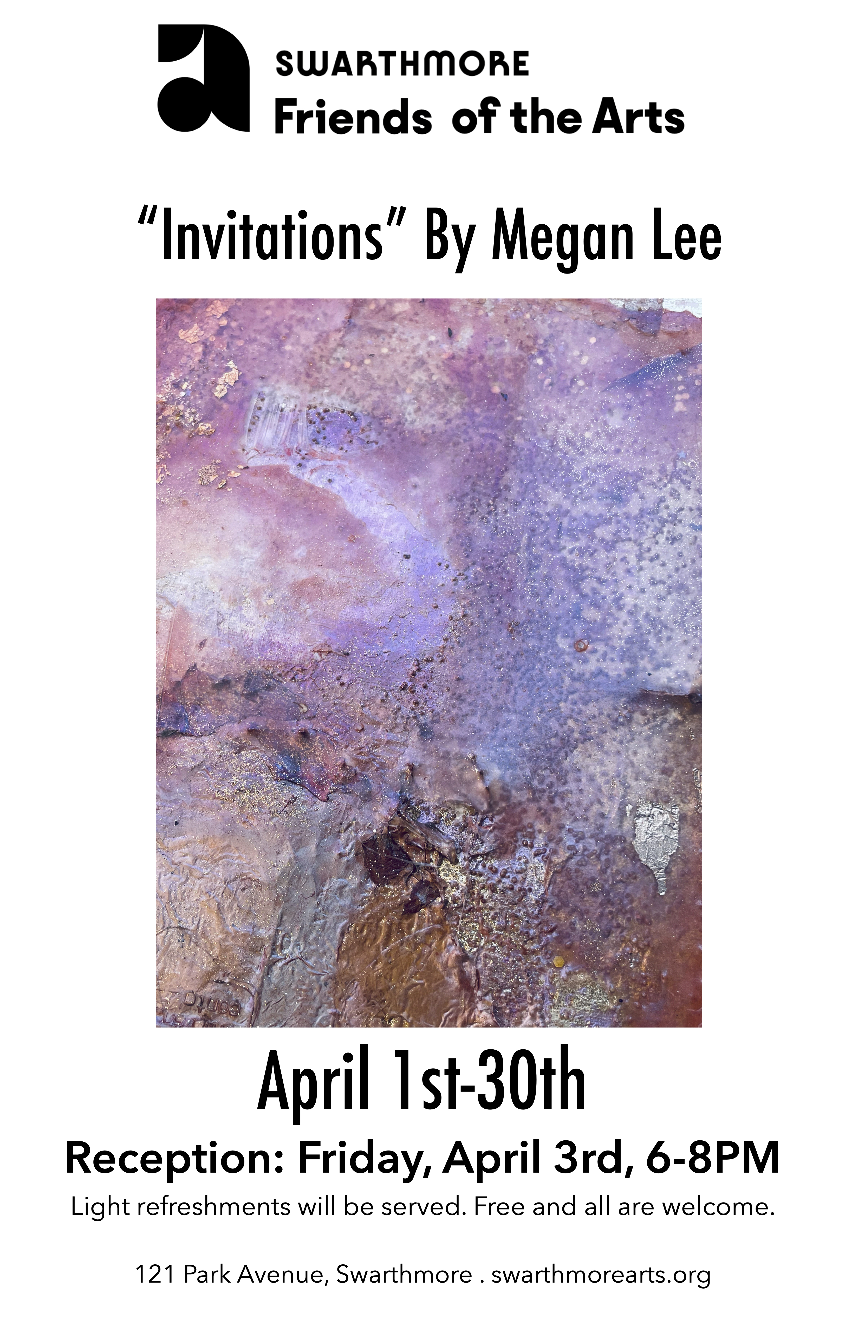 For information about Swarthmore Friends of the Arts or to submit a request for your own show, visit www.swarthmorearts.org or contact Martha Perkins, martha.perkins@gmail.com.